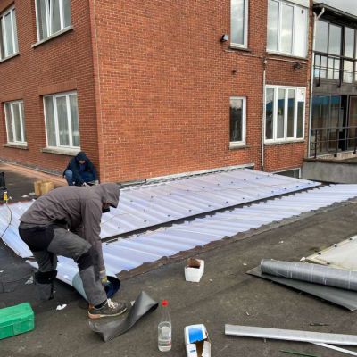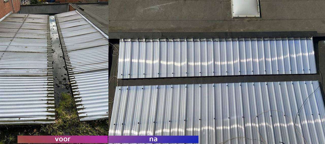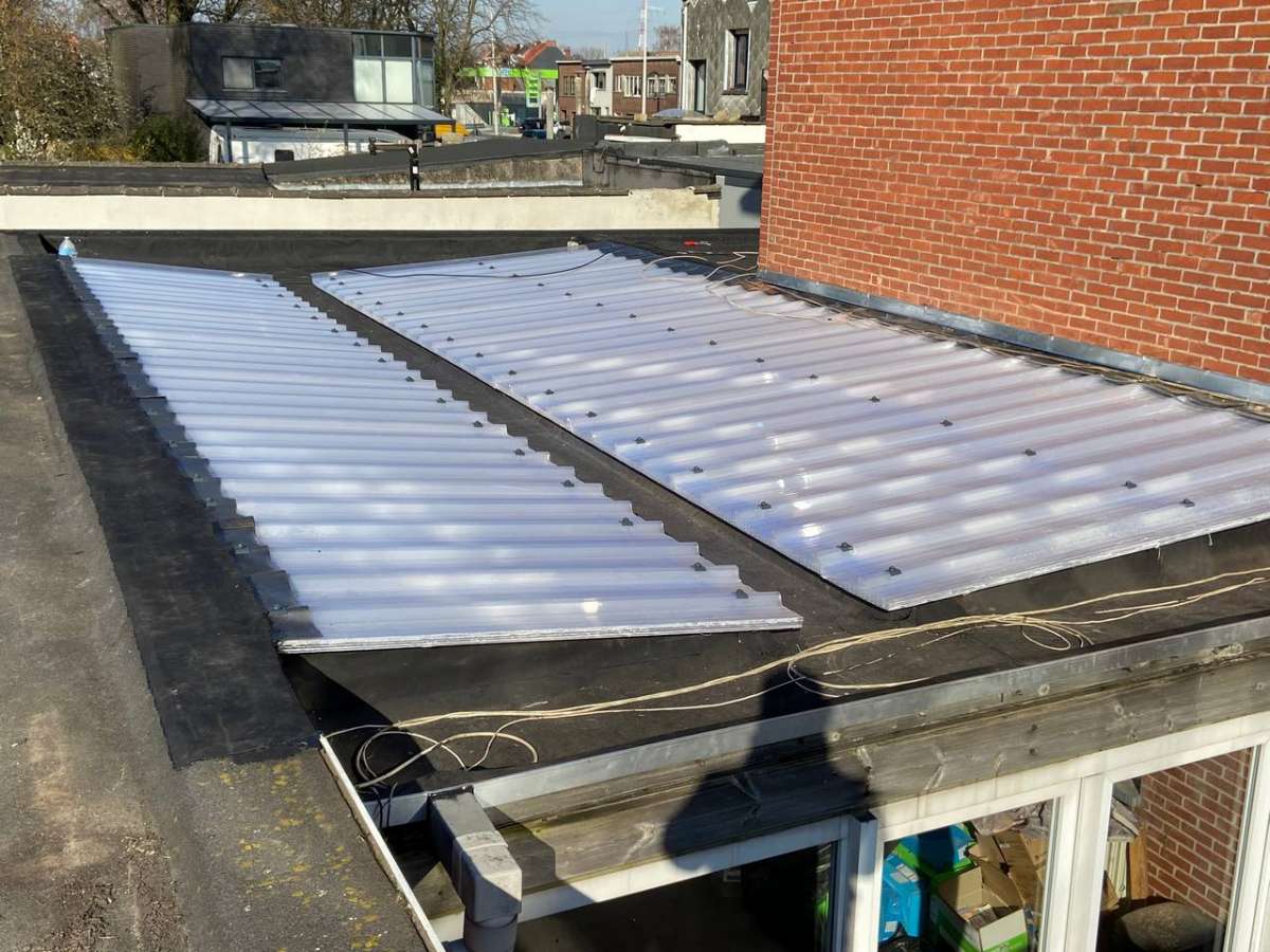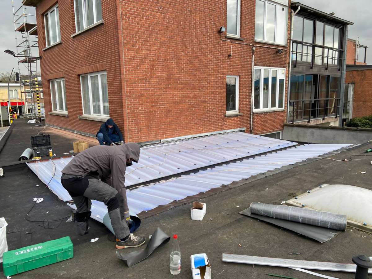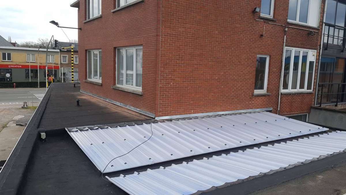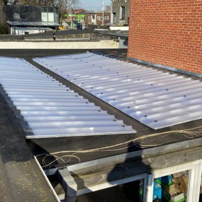 Oplossing: Afbraak- en evacuatie van de bestaande lichstraten, Plaatsing van Resitrix SKW op de bestaande afdichting, Plaatsing van Joriside Thermoroof lichtstraten 30mm ( even goed als dubbel glas), afwerking met zinken profielen tegen opgaand vocht en alu dakrand van 60mm.