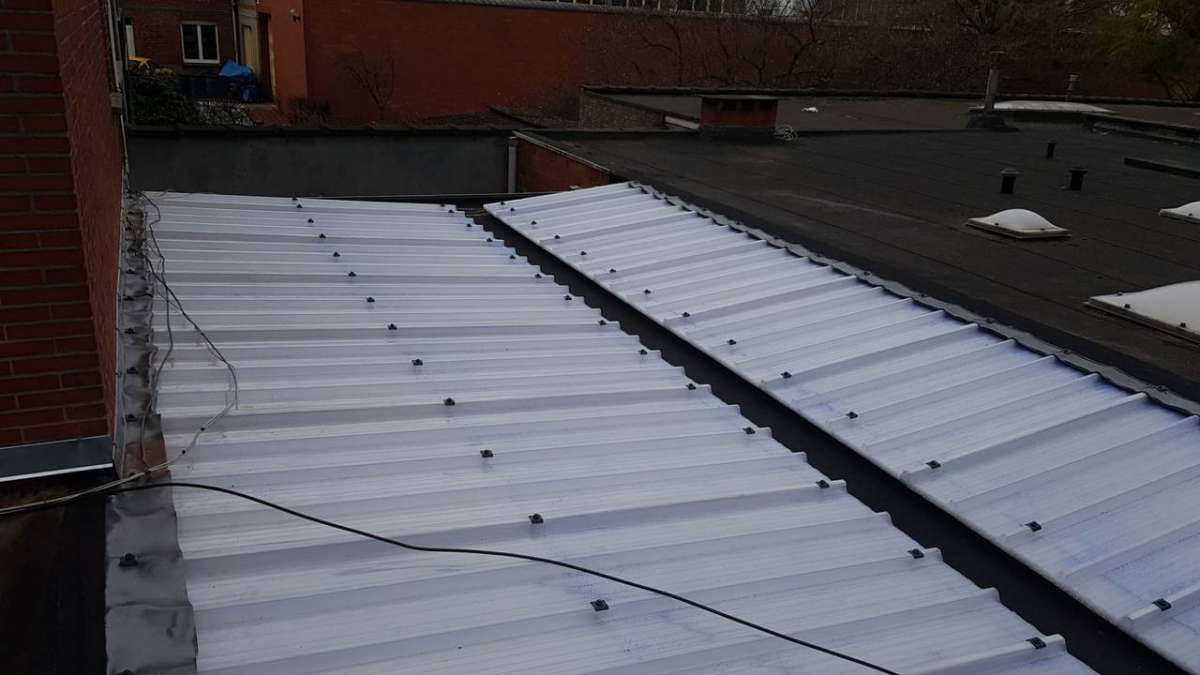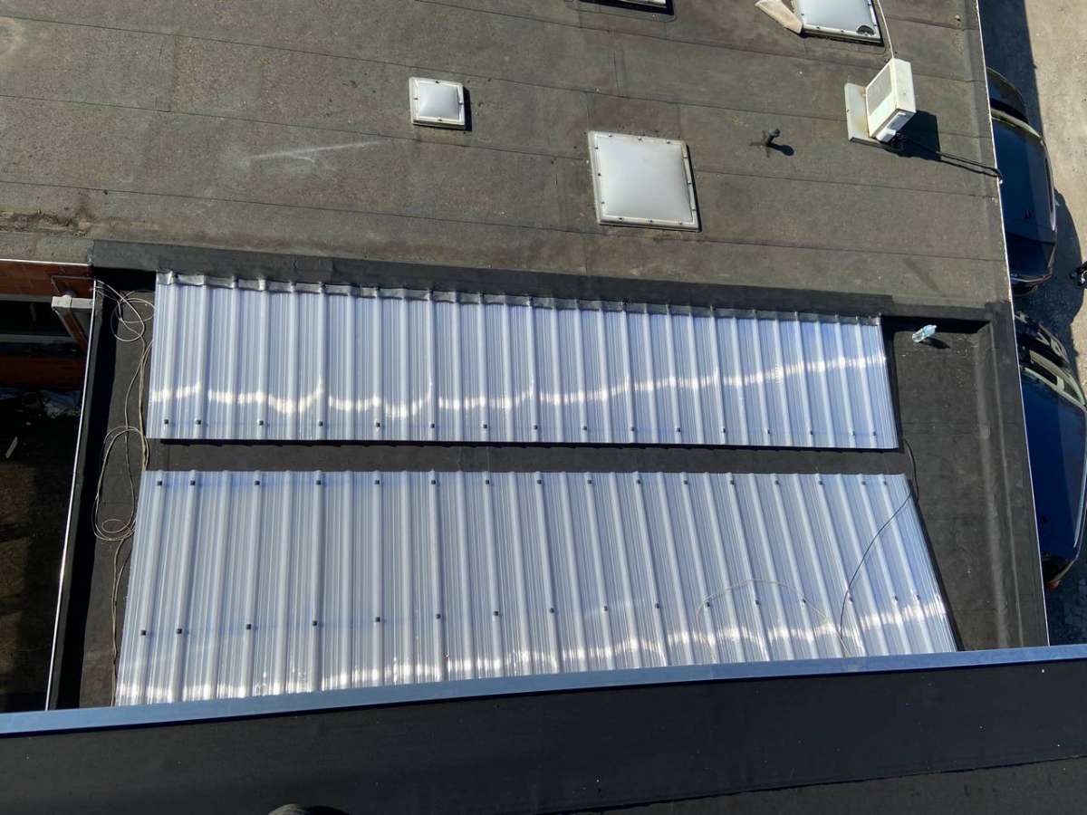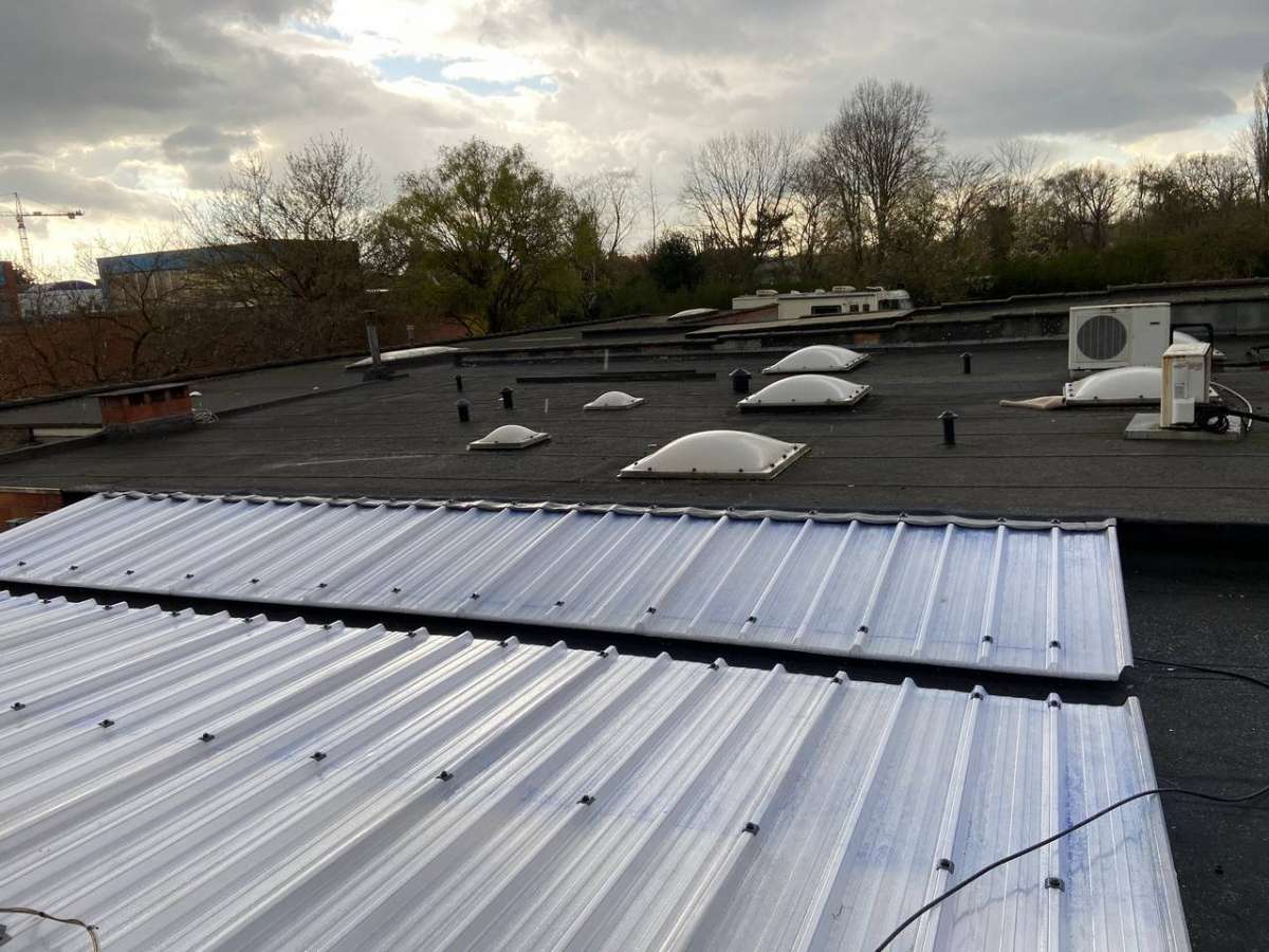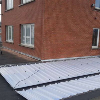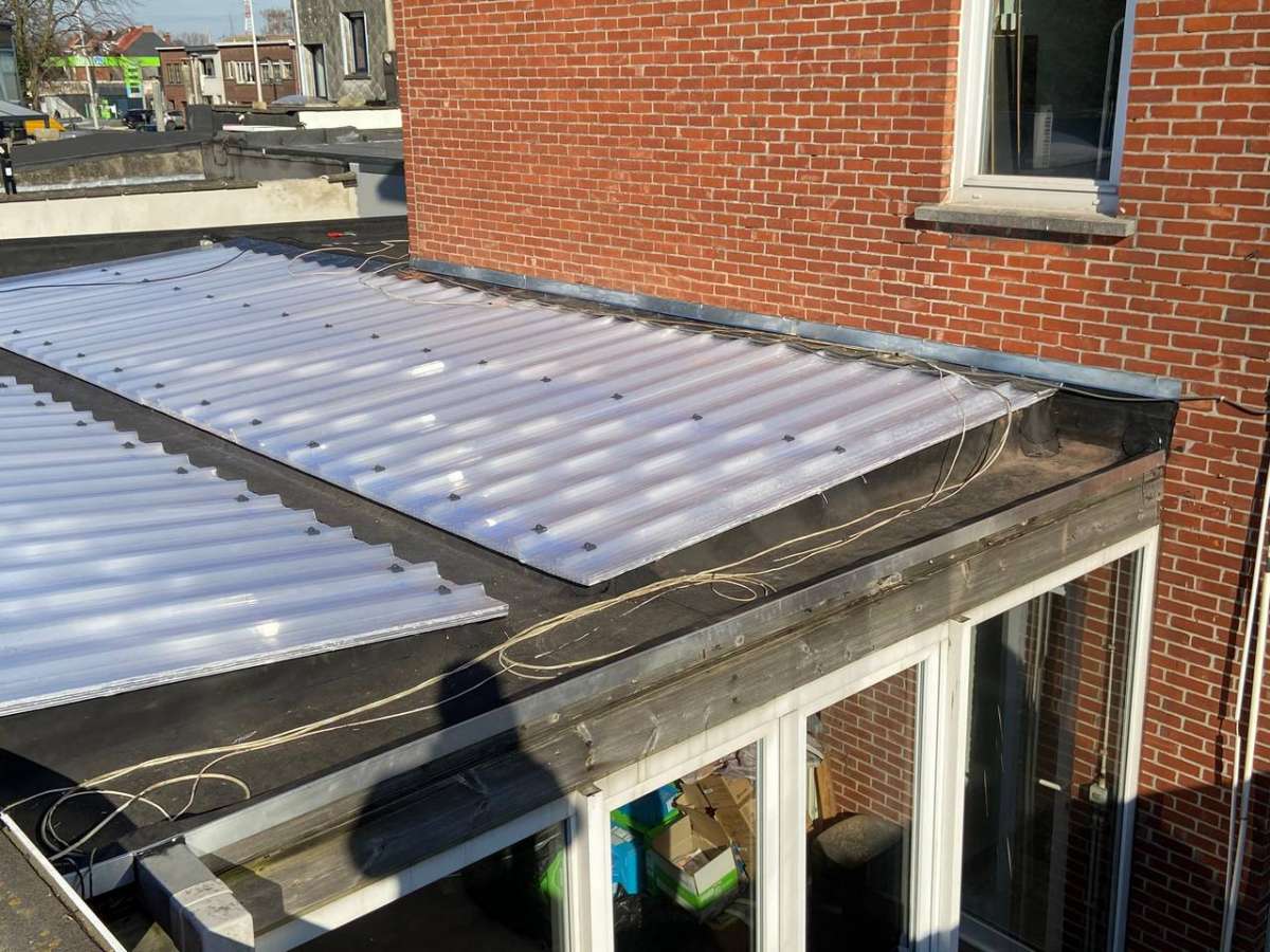 Oplossing: Afbraak- en evacuatie van de bestaande lichstraten, Plaatsing van Resitrix SKW op de bestaande afdichting, Plaatsing van Joriside Thermoroof lichtstraten 30mm ( even goed als dubbel glas), afwerking met zinken profielen tegen opgaand vocht en alu dakrand van 60mm.
