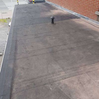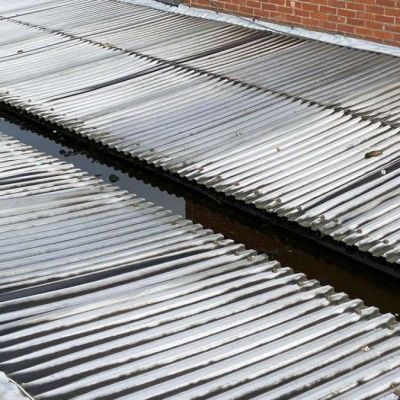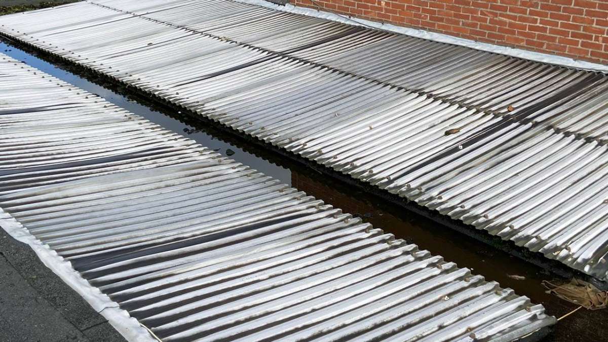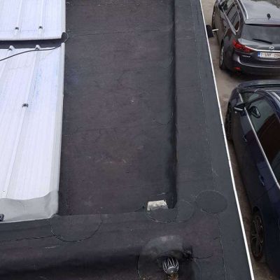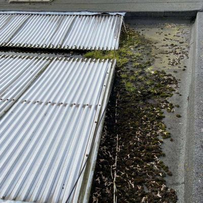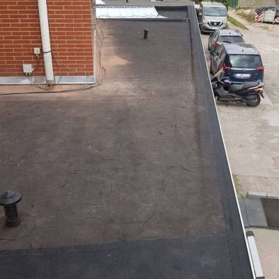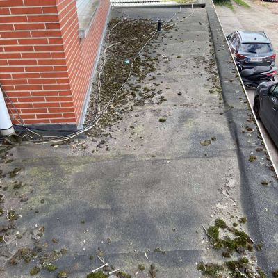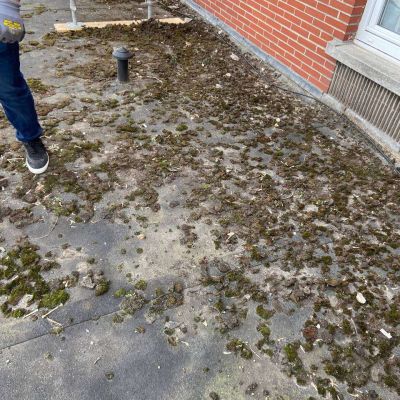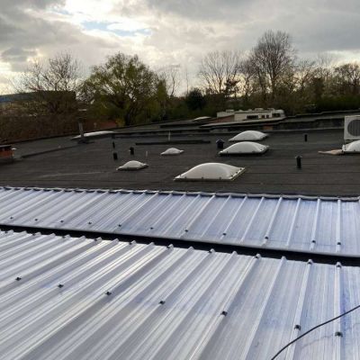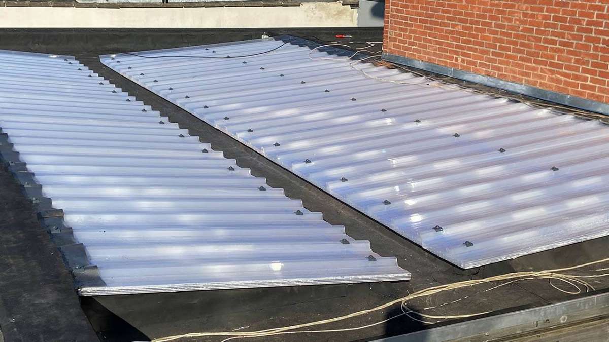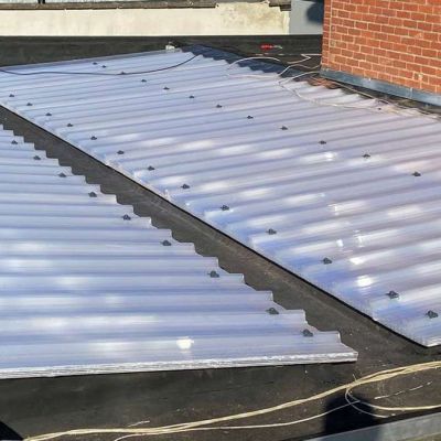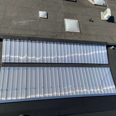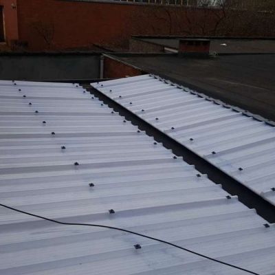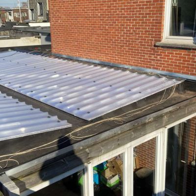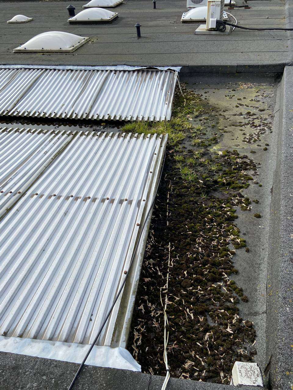 Oplossing: Afbraak- en evacuatie van de bestaande lichstraten, Plaatsing van Resitrix SKW op de bestaande afdichting, Plaatsing van Joriside Thermoroof lichtstraten 30mm ( even goed als dubbel glas), afwerking met zinken profielen tegen opgaand vocht en alu dakrand van 60mm.